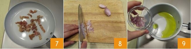 Hazlas dorar en una sartén antiadherente durante algunos minutos sin añadir aceite 7: en cuanto se forme una ligera costra en la superficie estarán listas. Ahora pica finamente el chalote 8. Viértelo en una cacerola grande y sofríelo con un poco de aceite 9.