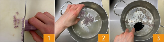 Para preparar el risotto con vino tinto y salchicha, como primer paso prepara el Caldo de verduras siguiendo nuestra receta y mantenlo caliente. Limpia y corta la chalota en daditos pequeños 1. En una cazuela derrite los 20 g de mantequilla, añade la chalota 2 y sofríe a fuego medio durante 5-6 minutos o hasta que se vuelva transparente 3.