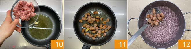 Une la salchicha 10 y dóralo durante 10 minutos 11. Cuando el arroz esté al dente añade la salchicha 12, sin la grasa liberada durante la cocción.