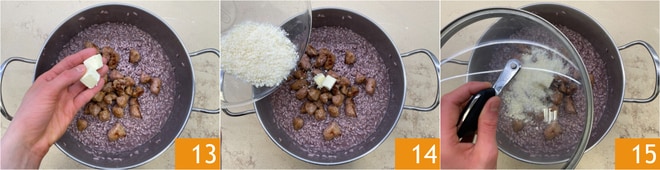 Incorpora la mantequilla 13 y el parmesano rallado 14. Cubre con tapa 15 y deja reposar durante 2 minutos.