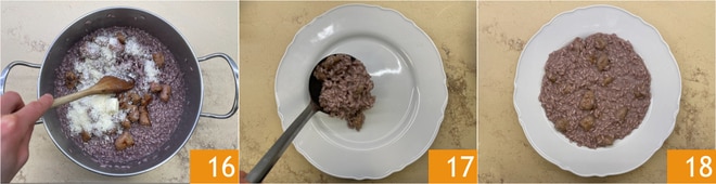 Manteca 16 y emplata 17. Tu risotto con vino tinto y salchicha está listo para ser degustado 18.