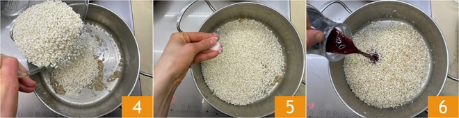 Pon también el arroz en la cazuela 4, ajusta de sal 5 y tuesta durante 2 minutos, removiendo continuamente, hasta que los granos se vuelvan brillantes. Desglasa con vino tinto 6 y deja evaporar toda la parte alcohólica.