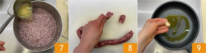 Añade un cucharón de caldo caliente de una en una 7 y lleva el arroz a cocción, hasta que esté al dente, tomarán unos 14 minutos, pero sigue las indicaciones del paquete. Mientras tanto, ocúpate de la salchicha, elimina la tripa separando pequeños trozos 8. En una sartén antiadherente vierte el aceite y añade el ajo 9.