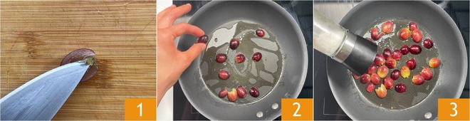 Para preparar el risotto al vino, uva y queso de cabra, primero lava y divide los granos de uva por la mitad, luego quita las semillas internas 1. Calienta un poco de aceite en una sartén y coloca los granos con la parte cortada hacia abajo 2. Saltea los granos durante un par de minutos, luego sala 3 y reserva.