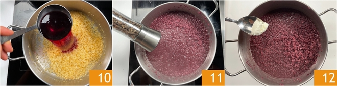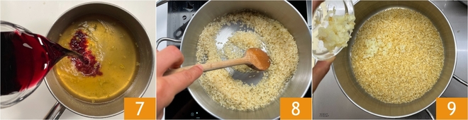 En una olla vierte el caldo vegetal y el vino tinto 7, luego lleva a ebullición y mantén caliente. Retoma la cacerola donde has cocido la cebolla y tuesta el arroz a fuego medio-alto durante unos 5 minutos, mezclando a menudo 8. Cuando los granos estén bien calientes, añade la cebolla 9.