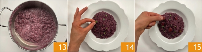 Mezcla bien para combinar todo 13. Decora los platos con unas hojitas de mejorana 14 y los granos de uva salteados 15. ¡Tu risotto al vino, uva y queso de cabra está listo para ser servido!