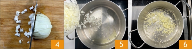 Ahora limpia y pica finamente la cebolla 4. Coloca la cebolla en una cacerola con un poco de aceite 5, sala y tapa. Rehoga durante unos 5 minutos a fuego medio-bajo, añadiendo un poco de agua si es necesario; no debe dorarse 6. Reserva.