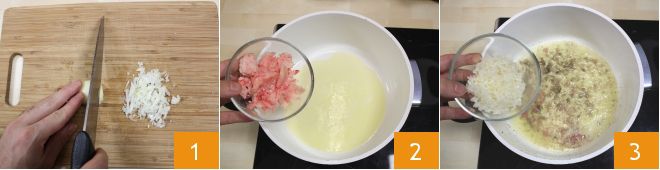 Para preparar el risotto al Amarone, comience picando finamente la chalota 1. En una cacerola, derrita 30 g de mantequilla junto con el tuétano de buey 2, agregue la chalota y déjela pochar con un cucharón de caldo de carne 3.