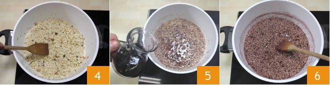 Añada el arroz y tuéstelo bien 4, luego vierta el Amarone poco a poco en dos o tres veces, esperando que el vino ya vertido se absorba bien 5. Se necesitarán al menos 5 minutos, durante los cuales removerá con una cuchara de madera 6.