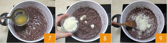 Continúe la cocción del risotto a fuego lento, agregando el caldo de carne un cucharón a la vez 7. Cuando el arroz esté bien al dente, apague el fuego y manteque el risotto con los 30 g restantes de mantequilla y con el queso Monte Veronese rallado 8, mezclando con la cuchara 9. ¡El risotto al Amarone está listo para servirse!
