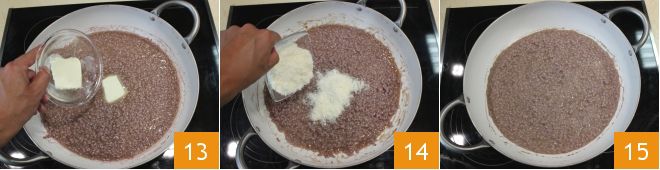 Proseguid la cocción añadiendo cuando sea necesario un cucharón de caldo vegetal 10, para preparar el caldo seguid nuestra receta Caldo de verduras. Añadid ahora el puré de uva fresa 11, mezclad bien hasta que se absorba, siempre a fuego lento, y continuad la cocción de vuestro risotto con uva fresa añadiendo un cucharón de caldo vegetal 12 cada vez que sea necesario hasta que esté completamente cocido, tardará unos 20 minutos.