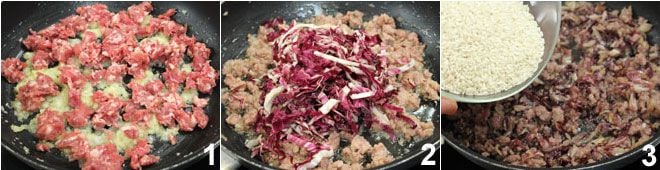 Para preparar el risotto a la cerveza con radicchio y salchicha, comienza cortando finamente el radicchio y picando la cebolla. Pon el aceite y la mantequilla en una cacerola, deja que se derrita, luego añade la cebolla y deja que se poche a fuego bajo durante 10-15 minutos. Añade la salchicha desmenuzada 1 y déjala blanquear, luego añade el radicchio 2 y deja que se poche a fuego lento, removiendo de vez en cuando. Cuando el radicchio esté pochado, añade el arroz 3 y déjalo tostar durante un par de minutos