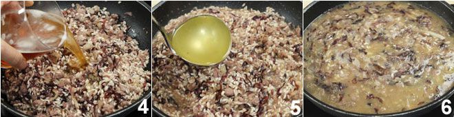 y luego rocía con la cerveza 4; cuando el líquido se evapore, continúa la cocción del risotto añadiendo un cucharón de caldo vegetal a la vez hasta la completa absorción del líquido anterior 5. Lleva el arroz a cocción 6, sala, pimienta y finalmente añade a gusto parmesano (o grana) rallado que mezclarás bien. Deja reposar el risotto a la cerveza con radicchio y salchicha por un minuto y luego emplata.