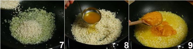 Ponga en una cacerola grande la cebolla picada y la mantequilla y deje dorar durante unos minutos; agregue el arroz 7 y déjelo tostar unos instantes, luego desglase con el vino blanco y deje cocinar hasta que el vino se haya evaporado. Luego, agregue un cucharón del líquido de cocción de la calabaza 8 y, posteriormente, el puré de calabaza 9;