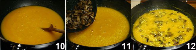 Continúe la cocción del arroz 10 y cinco minutos antes del final, añada las setas a la cacerola del arroz 11; deje que finalice la cocción, luego apague el fuego 12.