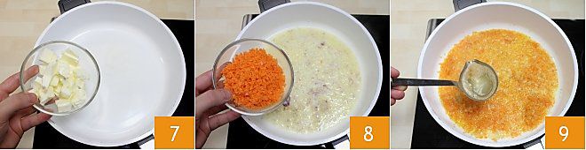 Mientras el caldo se cocina, tomad una sartén antiadherente y derretid la mantequilla 7, luego dejad pochar la chalota y la zanahoria finamente picadas 8, con un cucharón de agua para ablandar las verduras 9.