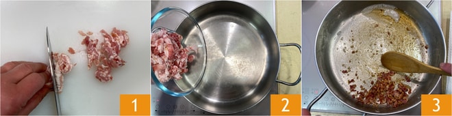 Para preparar el risotto al azafrán con taleggio y panceta, primero prepara el Caldo de verduras siguiendo nuestra receta. Corta la panceta en tiras 1, colócala en una cacerola 2 y cocina a fuego medio-alto durante 10 minutos 3. La grasa que libera se utilizará para tostar el arroz.