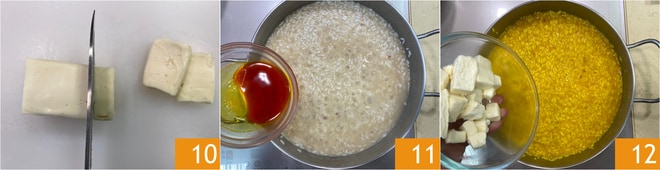 Corta el taleggio en cubos, eliminando la corteza 10. Cuando falten 5 minutos para el final de la cocción del risotto, añade el azafrán disuelto 11 y mezcla para integrarlo. Cuando el arroz esté cocido, apaga el fuego y mezcla con el taleggio 12.