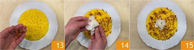 Sirve y completa con la panceta crujiente 13, luego adorna con algunos pétalos de raspadura 14. ¡Tu risotto al azafrán con taleggio y panceta está listo para servirse 15!