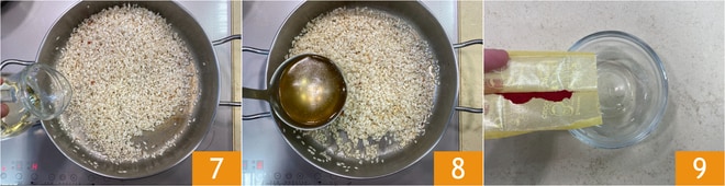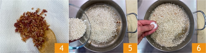 Pasa la panceta crujiente a papel absorbente 4 y reserva. En la misma cacerola, vierte el arroz 5, añade sal 6 y tuéstalo durante unos minutos, hasta que los granos estén calientes al tacto.