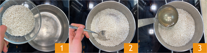 Para preparar el risotto amarillo a la naranja, primero prepara el Caldo de verduras siguiendo nuestra receta y mantenlo caliente. Vierte el arroz en una cacerola grande 1 y tuéstalo en seco, removiendo a menudo 2. Cuando se vuelva translúcido, empieza a mojarlo con un cucharón de caldo cada vez, esperando siempre que el líquido se absorba antes de añadir otro 3.