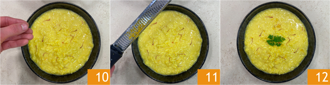 Adorna el risotto con los pistilos reservados 10 y finalmente aromatiza con la cáscara de naranja rallada 11. Completa con una hoja de perifollo y sirve inmediatamente tu risotto amarillo a la naranja 12!