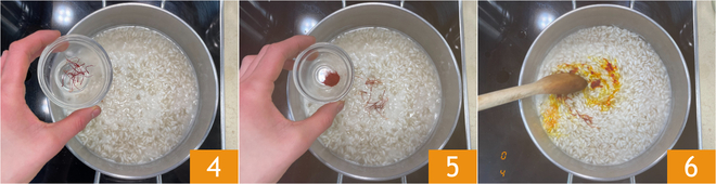Después de unos 6 minutos, añade el azafrán en pistilos 4 y en polvo 5, asegurándote de reservar algunos pistilos para el emplatado. Remueve delicadamente 6 y continúa la cocción durante un total de aproximadamente 14 minutos.