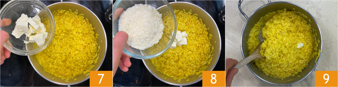 Una vez transcurrido el tiempo de cocción del arroz, apaga el fuego y manteca con la mantequilla fría 7 y el queso rallado 8. Mezcla todo 9 y deja reposar el risotto durante un par de minutos antes de emplatar.