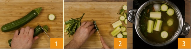 Para preparar el risotto con calabacín y stracchino, preparad el clásico caldo vegetal, manteniéndolo caliente. Cortad los extremos de los calabacines 1 y ralladlos todos, excepto uno. De este último, extraed la parte verde para cortarla en bastoncitos 2. Las partes blancas, en cambio, córtalas en trozos y junto con las partes recortadas, échalas en el caldo 3.