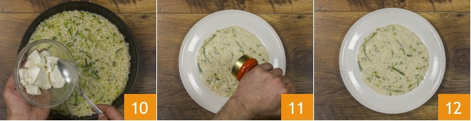 Al final de la cocción, apagad el fuego y mezclad con el stracchino removiendo hasta que se vuelva cremoso 10. Emplatad y adornad con una pizca de pimienta negra 11. Aquí está listo vuestro risotto con calabacín y stracchino, ¡buen provecho! 12.