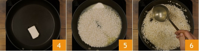 Mientras tanto, derretid la mantequilla en una cacerola 4, verted el arroz y dejad que se tueste un par de minutos, removiendo a menudo 5. Iniciad la cocción del arroz añadiendo el caldo caliente poco a poco: el arroz debe estar siempre cubierto con el caldo 6.