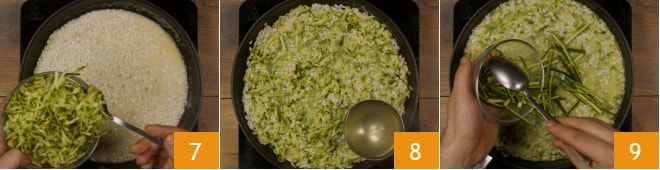 Después de unos minutos, verted los calabacines rallados 7 y continuad cocinando el arroz añadiendo poco a poco cucharones de caldo 8. Dejad que se absorban mezclando de vez en cuando. Cuando estéis casi al final de la cocción, ajustad de sal el arroz y añadid la piel del calabacín cortada en bastoncitos 9.
