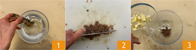 Para preparar el risotto con achicoria, mantequilla de anchoas y pan aromático, empezad con la crema de anchoas: después de desalar en agua durante unas horas, según sea necesario 1, picadlas finamente con un cuchillo 2. Transferid las anchoas picadas a un bol y añadid la mantequilla ablandada 3.