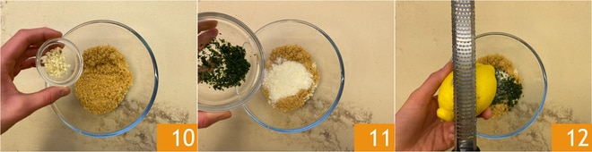 Transferid el pan rallado tostado a un bol y dejadlo enfriar, luego sazonad con el ajo picado 10, el Parmigiano Reggiano DOP rallado, las hojas picadas de apio y perejil 11, y la ralladura de limón 12.