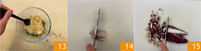 Salad, pimentad y mezclad, luego reservad 13. Limpiad y picad la chalota 14. Limpiad la achicoria eliminando la base más coriácea, luego cortadla finamente 15.