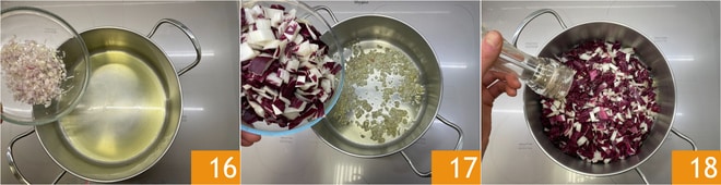 En una cacerola verted el aceite y la chalota 16, dorad a fuego lento y luego añadid la achicoria 17. Salad, pimentad 18 y cocinad durante 5 minutos. Transferid la achicoria cocida a un bol.
