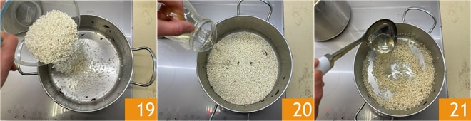 En la misma cacerola tostad el arroz en seco 19. Desglasad con el vino 20 y dejad evaporar. Cocinad el arroz agregando un cucharón de caldo a la vez, esperando siempre que el anterior haya sido absorbido antes de verter otro 21.