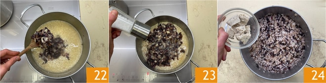 Después de unos 7-8 minutos añadid la achicoria 22, salad 23 y proseguid la cocción durante otros 7-8 minutos. Al final de la cocción quitad del fuego y mantecad con la mantequilla de anchoas fría de la nevera 24.