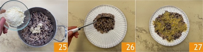 Añadid también el Parmigiano Reggiano DOP rallado 25 y mezclad para obtener una consistencia cremosa. Emplatar el risotto 26 y completad con las migas de pan aromático y ralladura de limón. ¡Vuestro risotto con achicoria, mantequilla de anchoas y pan aromático está listo para ser servido 27!