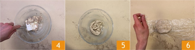 Mezclad con una espátula 4 para crear una mezcla cremosa 5. Envolvéd la mezcla en film transparente 6 y guardadla en el frigorífico durante unos 30 minutos.