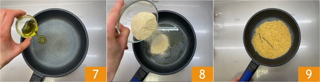 En una sartén calentad el aceite 7, luego añadid el pan rallado 8 y tostádlo hasta que esté dorado 9.