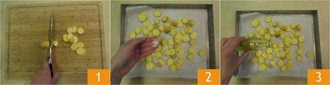 Para preparar el risotto lava, seca y corta las patatas nuevas en rodajas de aproximadamente 2 mm 1, colócalas en una bandeja forrada con papel de horno y condiméntalas con sal 2 y aceite 3. Cocínalas en horno precalentado a 200 grados durante 30 minutos.