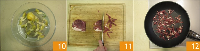 Mantenlas en un bol con agua y zumo de limón para evitar que se oscurezcan 10. Mientras tanto, corta el jamón en tiras 11 y échalo en una sartén bien caliente 12.