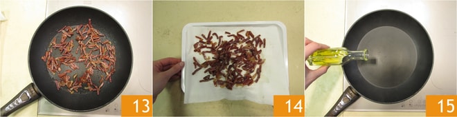 Saltéalo bien a fuego alto. Cuando esté crujiente 13 colócalo sobre un papel absorbente 14 y resérvalo. Calienta un poco de aceite en la misma sartén 15.