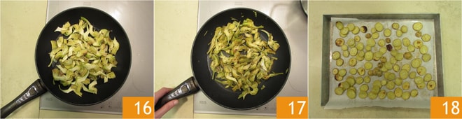 añade las alcachofas 16 y cocínalas a fuego alto (tomará unos 6/7 minutos) y salpícalas. Cuando estén bien doradas 17 apaga el fuego y resérvalas. Mientras tanto, las patatas ya se habrán cocido, sácalas del horno 18 y mantenlas a temperatura ambiente.