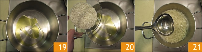 Comienza con la cocción del risotto. En una cacerola calienta un poco de aceite 19, añade el arroz 20 y tuéstalo durante unos minutos. Desglasa con un cucharón de caldo vegetal 21