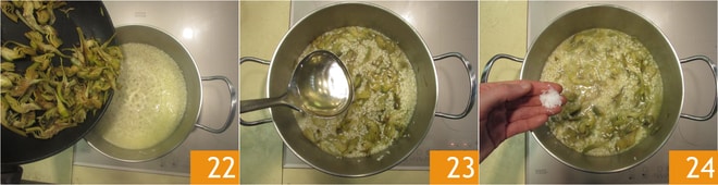 Añade ¾ de las alcachofas, reserva las otras para el emplatado. Continúa la cocción del arroz durante unos 15 minutos, removiendo de vez en cuando y añadiendo un cucharón de caldo cada vez que el arroz comience a secarse 23, sala a gusto 24.