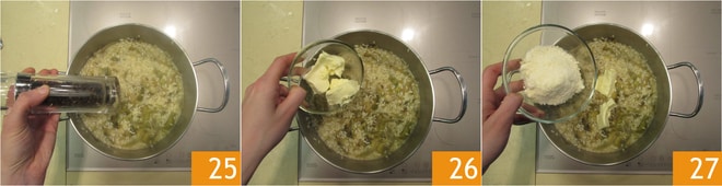 Cuando la cocción esté completa, apaga el fuego y ajusta de sal y pimienta 25. Remueve con la mantequilla 26, el parmesano 27 y mezcla.