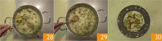Finaliza añadiendo las patatas asadas 28 y mezcla delicadamente 29. Emplata tu arroz y coloca encima algunos gajos de alcachofa, algunas rodajas de patata y el jamón crujiente. ¡Tu risotto con alcachofas y patatas está listo para ser servido bien caliente!