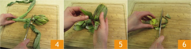 Mientras tanto, limpia las alcachofas: corta parte del tallo 4, elimina las hojas más externas 5 y la punta 6.